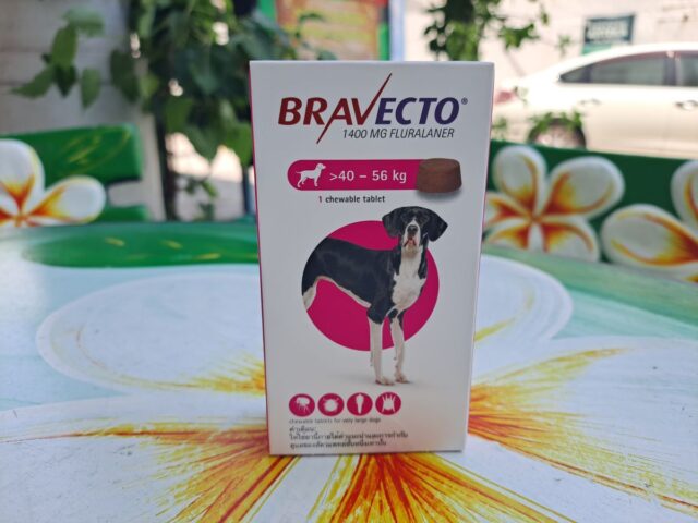 Дозировка таблеток Бравекто в картонной коробке с малиновым кружочком рассчитана на собак весом 40-56 кг. Это 1400 мг действующего вещества.