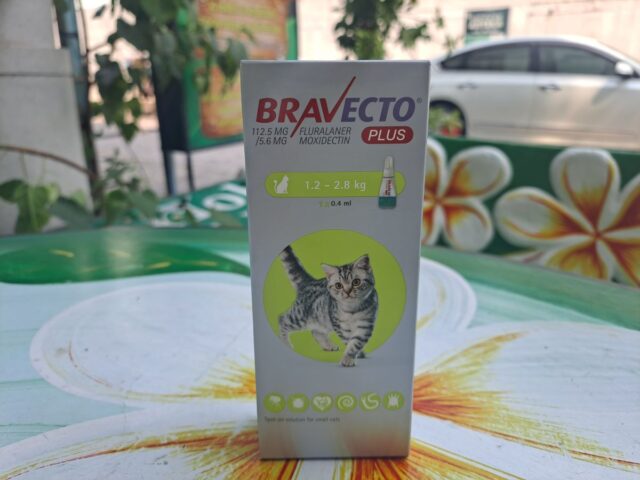 Капли на холку Бравекто Плюс в коробке с неоновым кружочком разработаны специально для небольших кошек – 1,2-2,8 кг. Дозировка флураланера- 112,5 мг