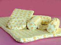 В комплект постельных принадлежностей входят: подушка из латекса, подушка в виде «бублика», латексные валики фиксирующего типа, валик и универсальный матрас размером 120см60см2.5.