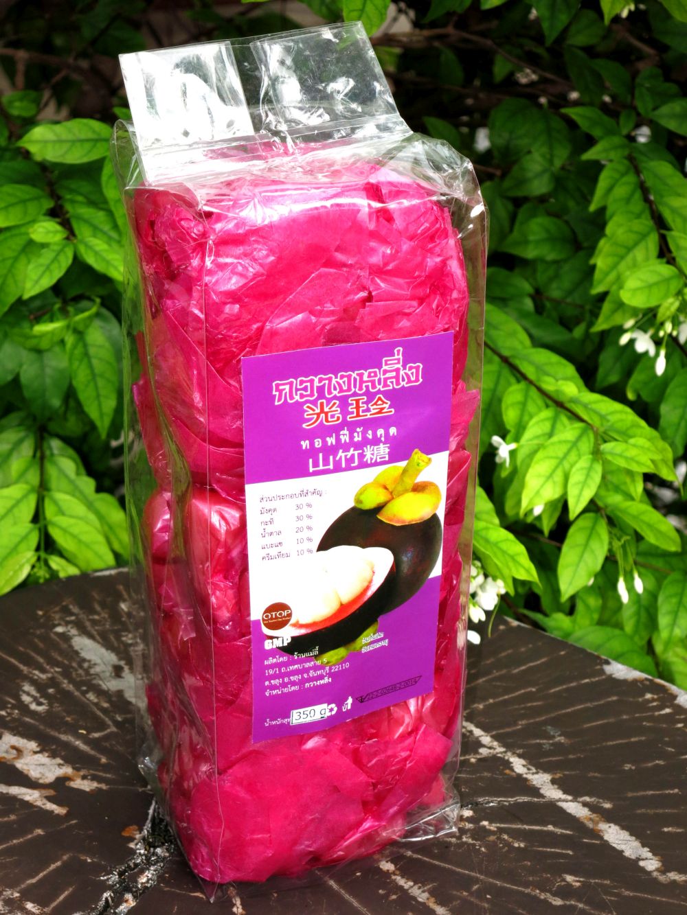 Мангустин – один из самых необычных и вкусных фруктов Таиланда: его вкус одновременно и экзотический, и “универсальный” – т.е. нравится и азиатам, и людям Запада, в отличие от неоднозначного дуриана, например. В составе конфет только натуральные ингредиенты – патока, кокосовый сахар, сок и мякоть мангустина. Простой рецепт и максимум полезных свойств, которые удалось сохранить.