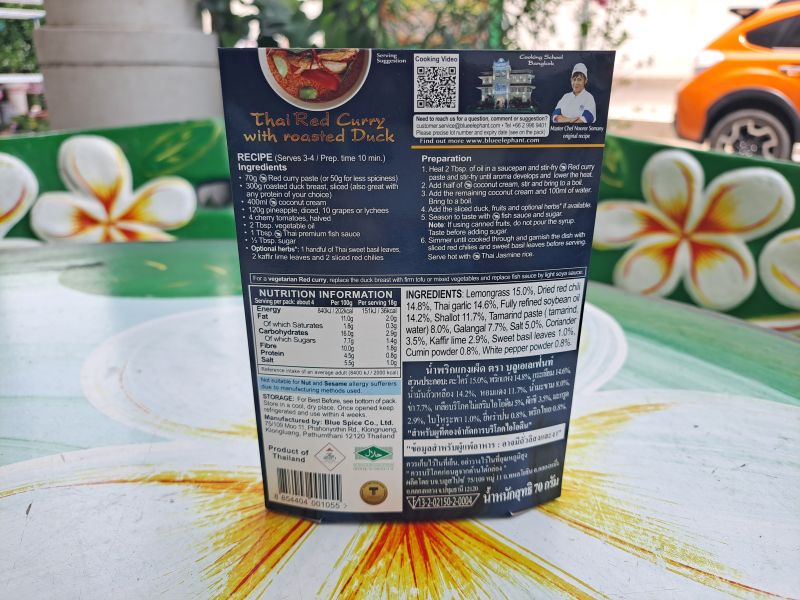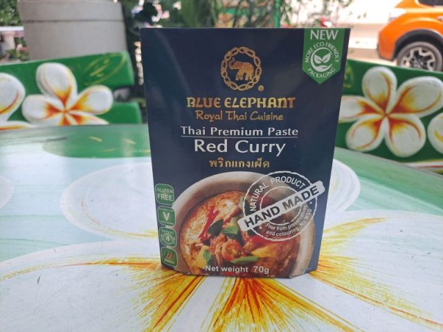 Паста красный карри готова к разогреву и готовится только из тайских продуктов и специй путем идеального сочетания кокосового молока, сушеного красного перца чили, лемонграсса, чеснока, лука-шалота, галангала, кафир-лайма, листьев сладкого тайского базилика, чеснока, кориандра, порошка тмина и рыбного соуса, который непременно подчеркнёт ваше подлинное тайское блюдо!
