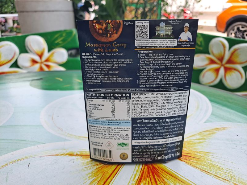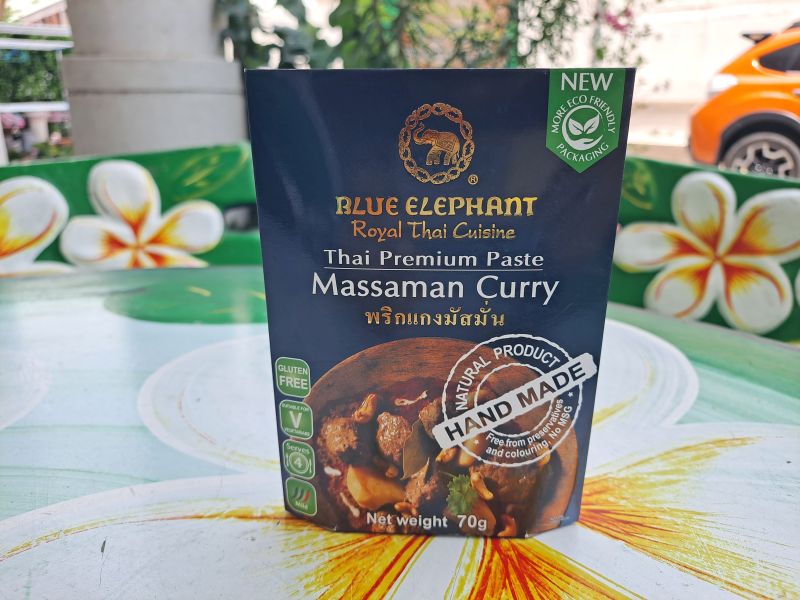 Paste massaman Curry Blue Elephant Royal Thai Cuisine – это основа для приготовления тайского карри Массаман, одного из шести самых знаменитых и вкусных тайских карри. Его готовят на основе пряной пасты и кокосового молока с картофелем и курицей и или говядиной. Суп имеет богатую вкусовую гамму и умеренный уровень остроты.