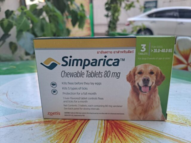 Таблетки симпарика содержат 80 мг сароланера, что подходит для крупных собак от 20 до 40 кг.