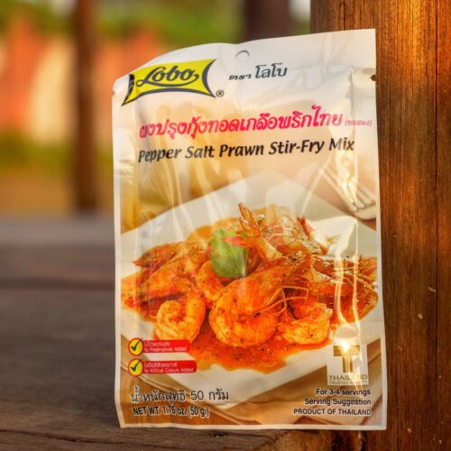 Pepper Salt prawn Stir-Fry Mix – это приправа для приготовления жареных креветок особым тайским способом. Обычно для этого блюда используются королевские креветки, т.е. крупных размеров. Однако даже обычные небольшие креветки, зажаренные таким способом, – это тоже вкусно, экзотично и напоминает о незабываемой кухне любимого Таиланда.